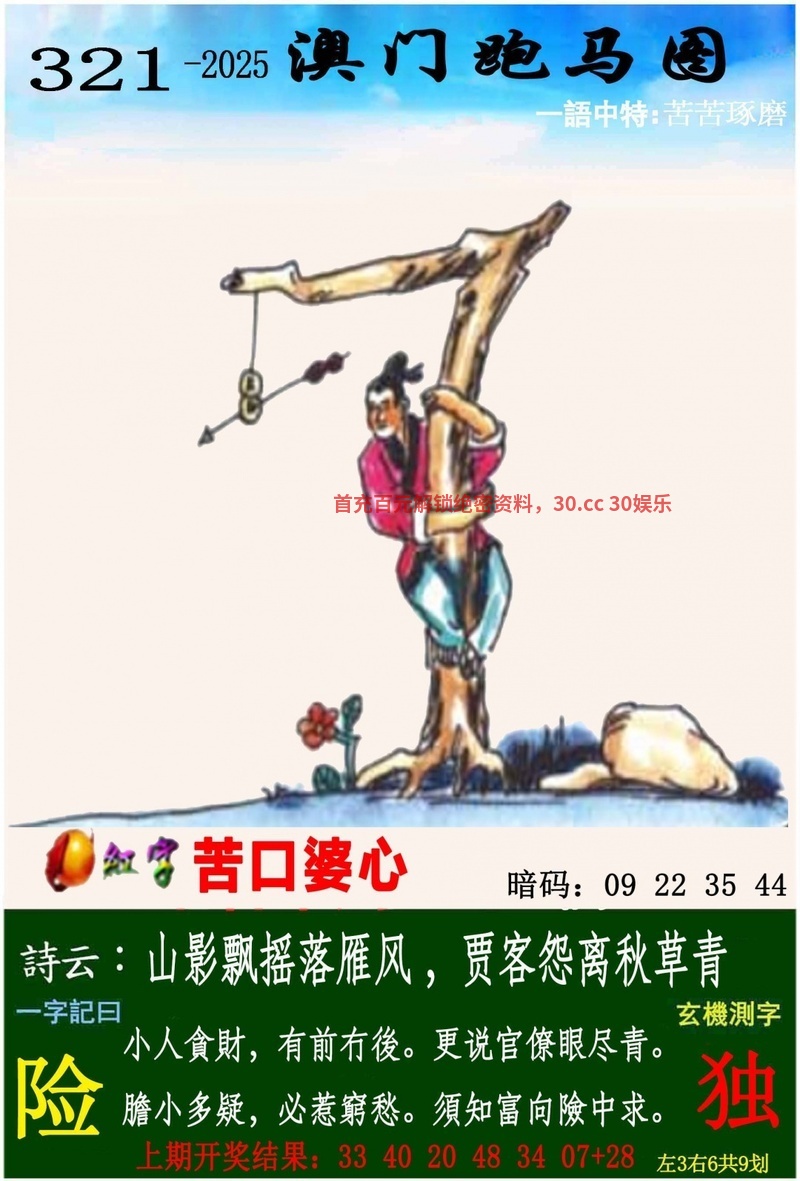 | 321期一字記曰:【险】 小人贪财,有前冇后,更说官僚眼尽青。胆小多疑,必惹穷愁,须知富向险中求。《独》 解:山影飘摇落雁风:山影飘摇解羊鸡猴猪鼠兔虎。 生肖:羊鸡猴猪鼠兔 |